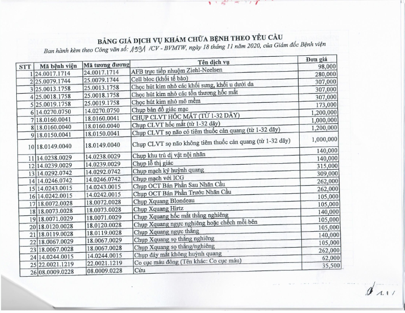 Bảng giá dịch vụ khám chữa bệnh theo yêu cầu