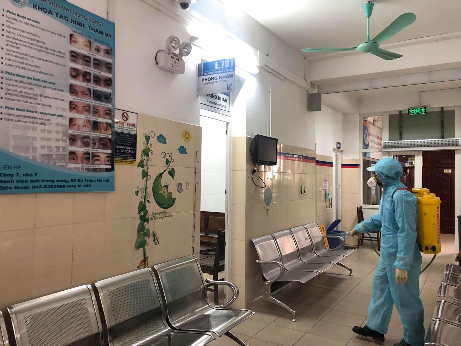 Bệnh viện đã tiến hành phun thuốc khử khuẩn bệnh viện bao gồm khu đón tiếp người bệnh, các khoa phòng làm việc, buồng bệnh, hành lang, cầu thang, sân vườn... để đảm bảo công tác phòng dịch hiệu quả nhất