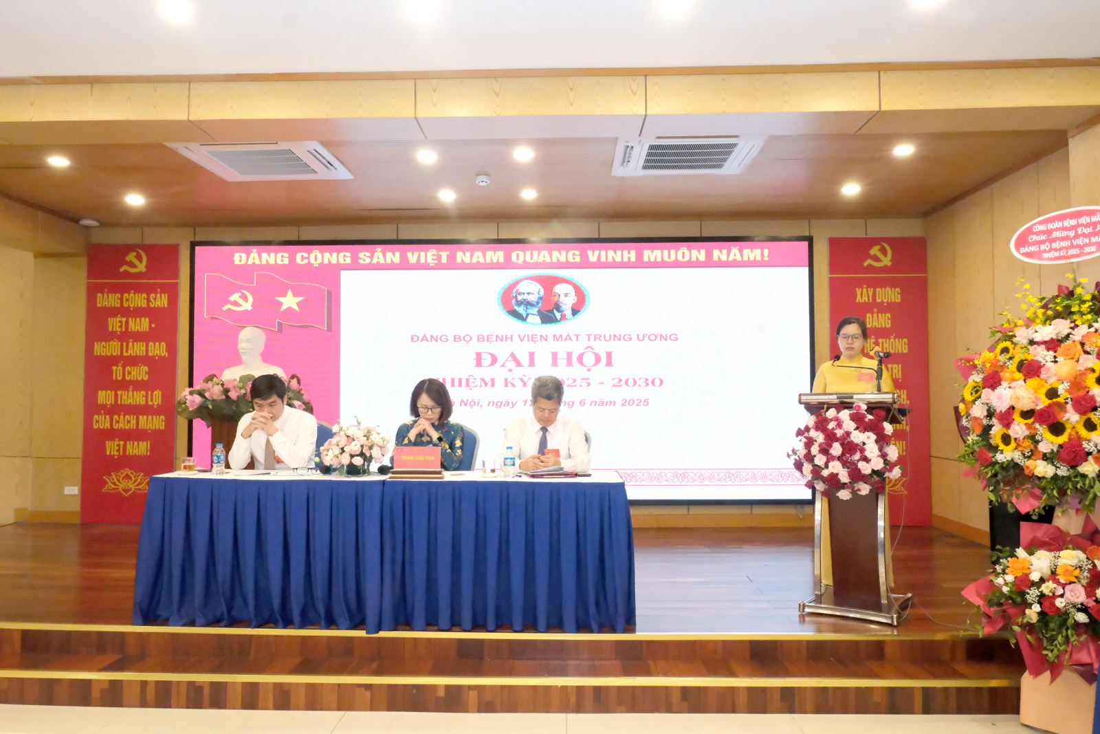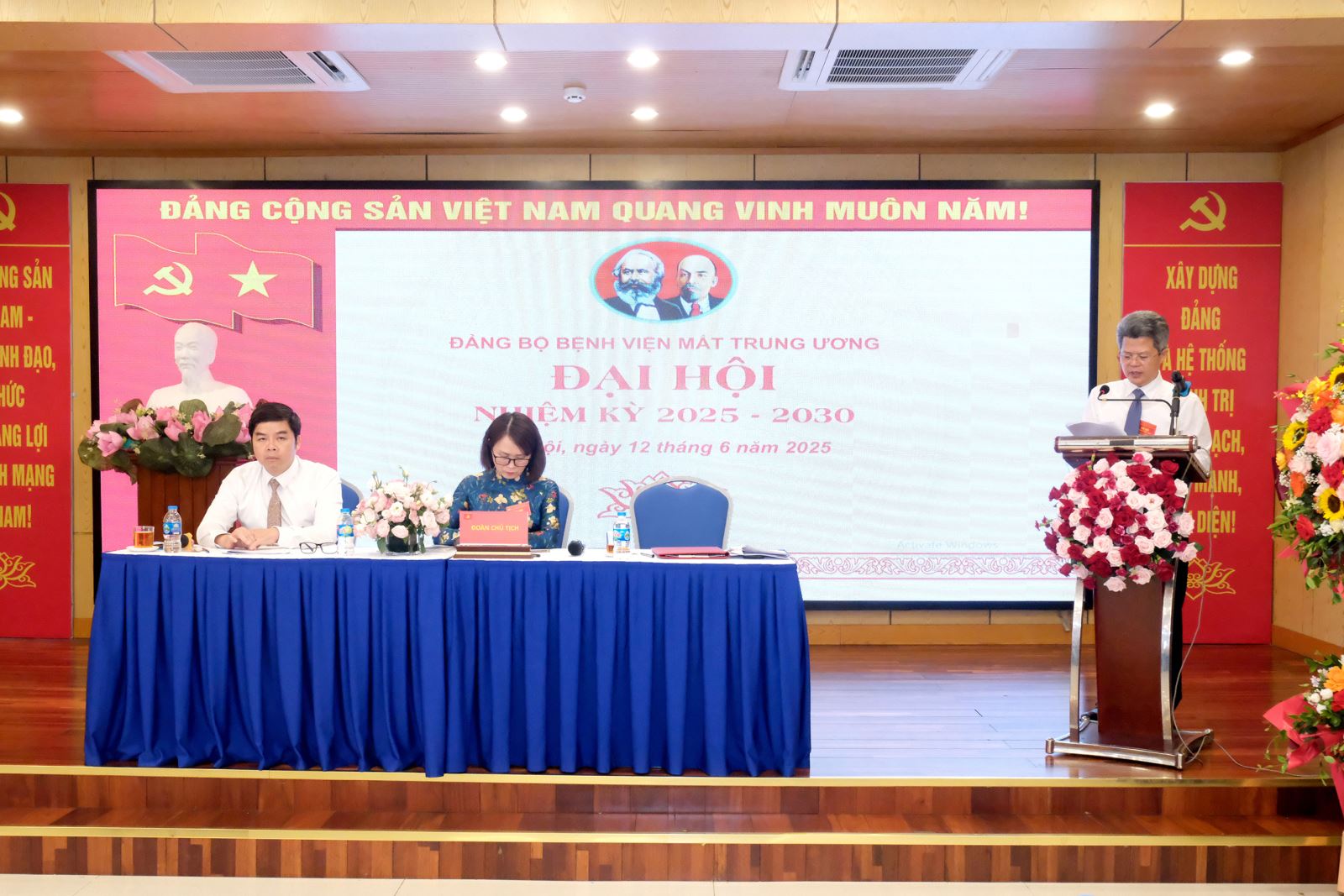 Mở đầu chương trình đồng chí Phạm Ngọc Đông –TV Đảng ủy nhiệm kỳ 2020-2025, Giám đốc Bệnh viện lên khai mạc Đại hội và trình bày Báo cáo chính trị của BCH Đảng bộ Bệnh viện Mắt TW trình Đại hội Đảng bộ Bệnh viện MTW nhiệm kỳ 2025-2030 và Báo cáo kiểm điểm của BCH.