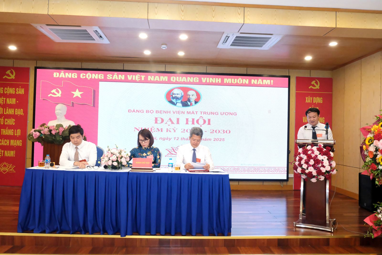 Đồng chí Trần Trung Kiên thay mặt Đoàn thư ký lên trình bày dự thảo Nghị quyết Đại hội Đảng bộ Bệnh viện Mắt Trung ương nhiệm kỳ 2025 – 2030 với số Đảng viên tán thành là 130 Đảng viên chính thức .