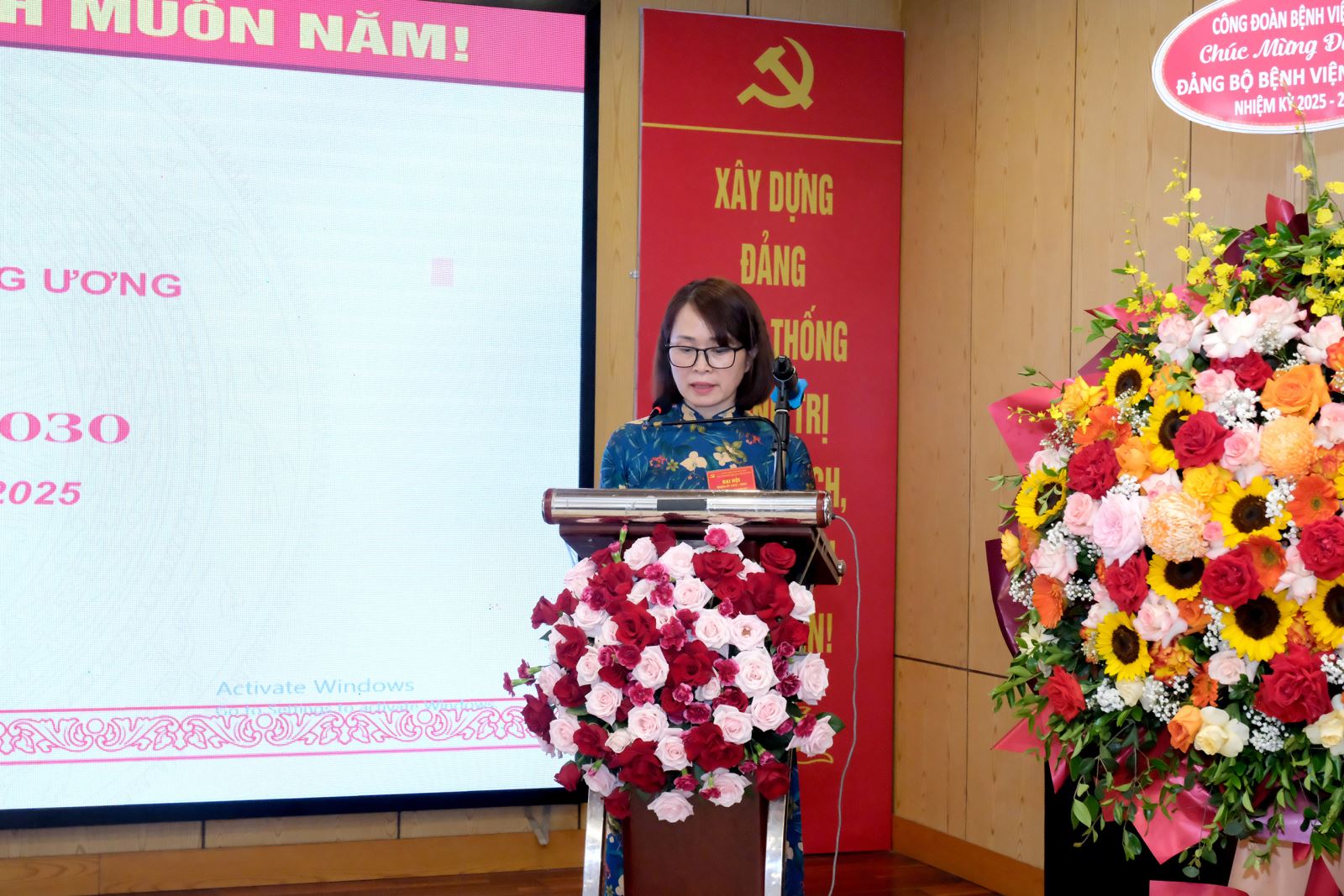 - Đã kiểm điểm, đánh giá sâu sắc kết quả thực hiện Nghị quyết Đại hội Đảng bộ nhiệm kỳ 2020-2025, xác định phương hướng, mục tiêu nhiệm kỳ 2025-2030, bầu BCH Đảng bộ Bệnh viện nhiệm kỳ 2025-2030 đủ số lượng, cơ cấu, đảm bảo tiêu chuẩn, phẩm chất và năng lực, thể hiện tính kế thừa, liên tục, tiêu biểu cho ý chí và nguyện vọng của Đảng bộ và cán bộ nhân viên. Tin tưởng rằng, các đồng chí được bầu vào Đảng ủy nhiệm kỳ này sẽ tiếp tục rèn luyện học tập, nâng cao trình độ, phấn đấu hoàn thành xuất sắc nhiệm vụ được giao.