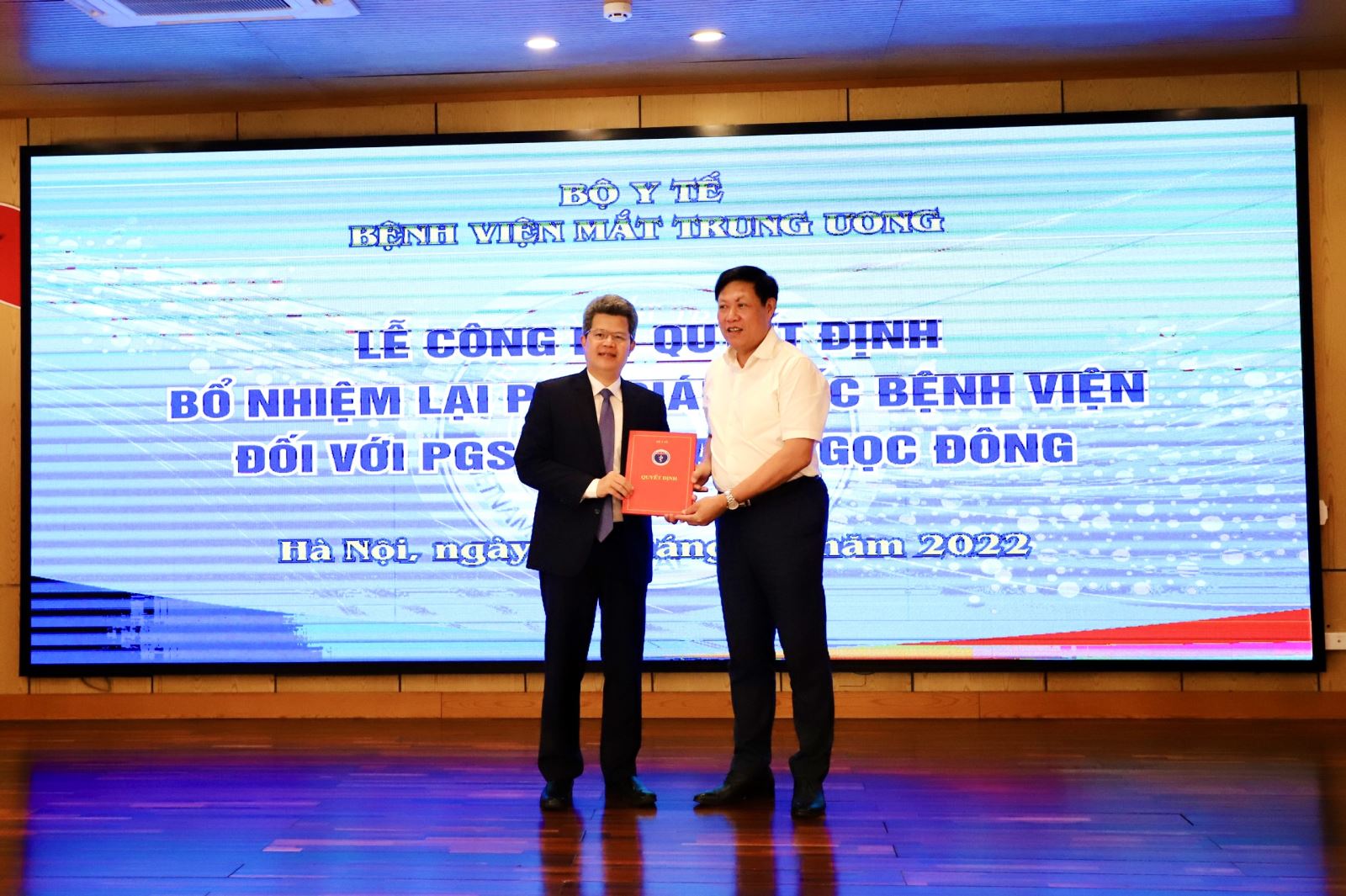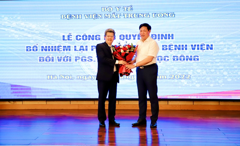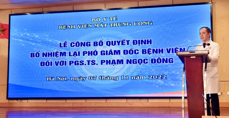 Theo đó, tại Quyết định số 2960/QĐ/BYT ngày 31/10/2022 của Bộ trưởng Bộ Y tế quyết định bổ nhiệm lại Phó Giám đốc phụ trách chuyên môn Bệnh viện Mắt Trung ương đối với PGS.TS.Phạm Ngọc Đông. Quyết định có hiệu lực 05 năm kể từ ngày quyết định có hiệu lực.