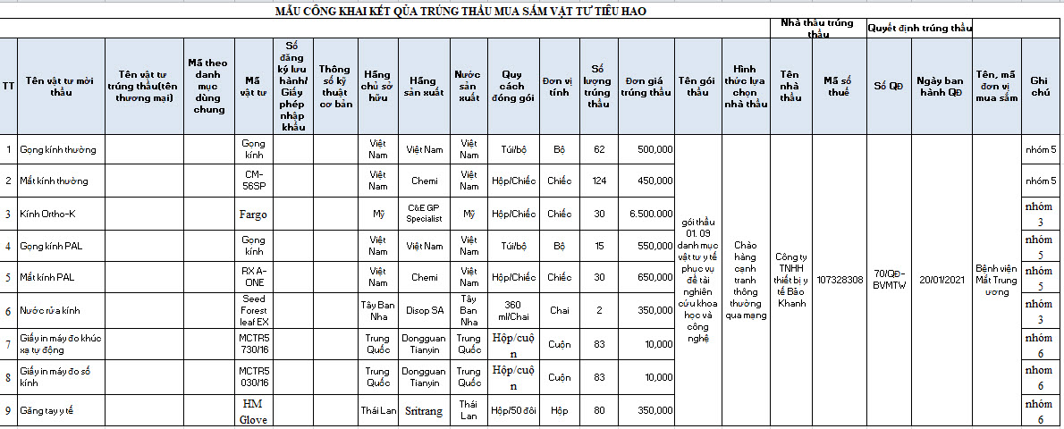 Công khai kết qủa trúng thầu mua sắm Vật tư tiêu hao