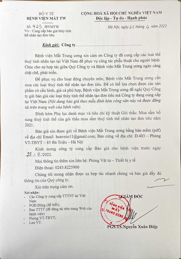 Thư mời báo giá để tham khảo làm cơ sở xây dựng các dữ liệu cho dự toán văn phòng phẩm, vật phẩm hành chính sử dụng trong 02 năm 2026-2027 tại Bệnh viện Mắt Trung ương