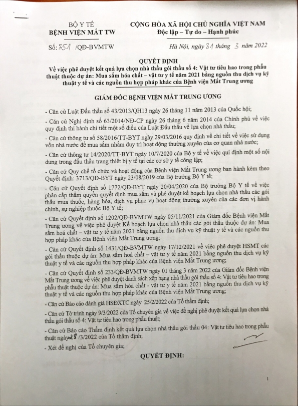 Gói số 4: Vật tư tiêu hao trong phẫu thuật thuộc dự án: Mua sắm hóa chất - vật tư y tế năm 2021 bằng nguồn thu dịch vụ kỹ thuật y tế và các nguồn thu hợp pháp khác của Bệnh viện Mắt Trung ương