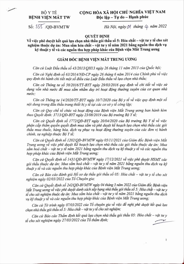 Gói số 1: Hóa chất - vật tư phù hợp theo máy thuốc dự án: Mua sắm hóa chất - vật tư y tế năm 2021 bằng nguồn thu kỹ thuật y tế và các nguồn thu hợp pháp khác của Bệnh viện Mắt Trung ương
