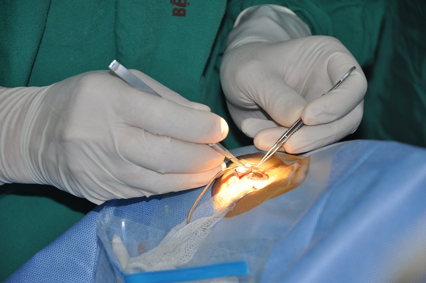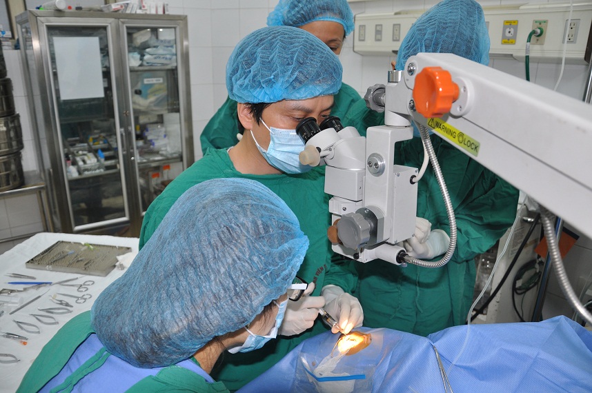 TS Lê Xuân Cung - Trưởng khoa Kết Giác mạc cùng ekip đang thực hiện ca ghép