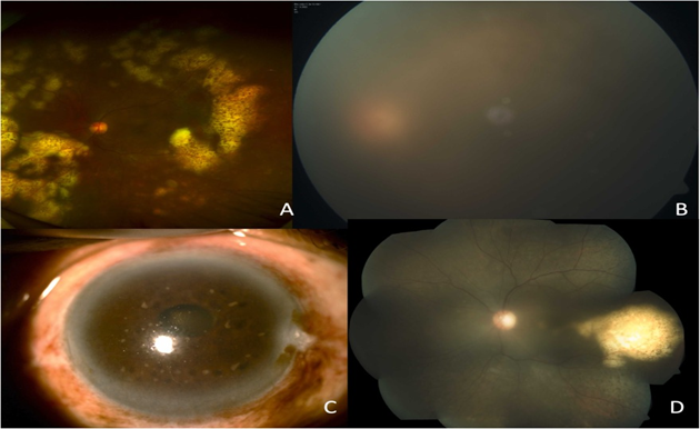 A-B: u nguyên bào võng mạc có tế bào xâm nhiễm tiền phòng, C-D: u biểu mô tủy khi khám đèn khe và siêu âm UBM, E-F di căn hắc mạc đa ổ