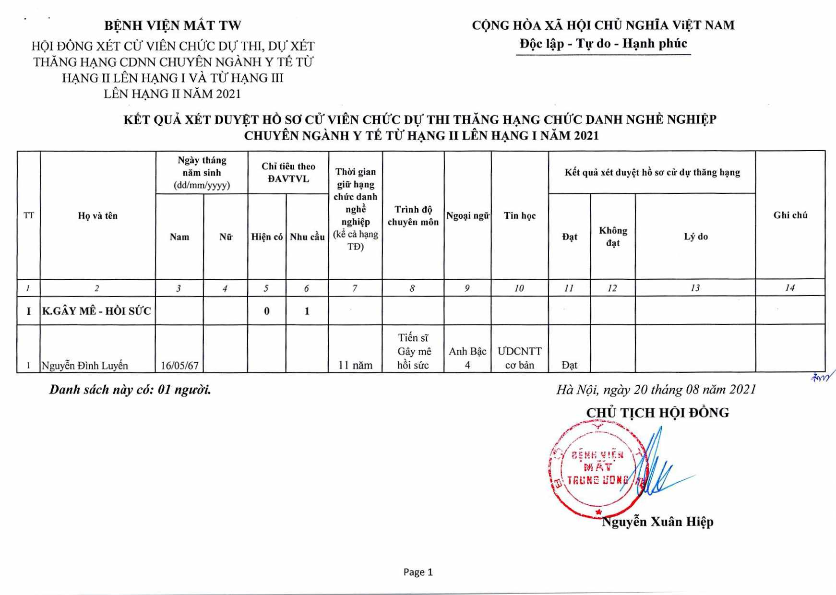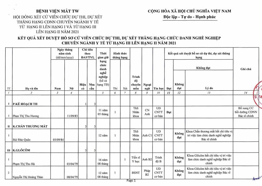 Kết quả duyệt hồ sơ cử viên chức dự thi thăng hạng chức danh nghề nghiệp chuyên ngành y tế từ hạng II lên hạng I năm 2021