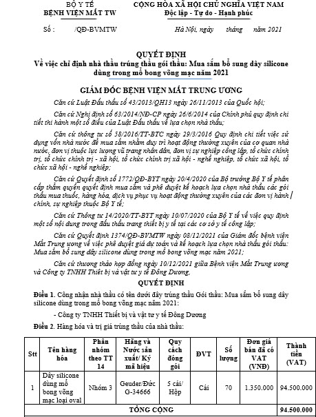 QUYẾT ĐỊNH: Về việc chỉ định nhà thầu trúng thầu gói thầu: Mua sắm bổ sung dây silicone dùng trong mổ bong võng mạc năm 2021