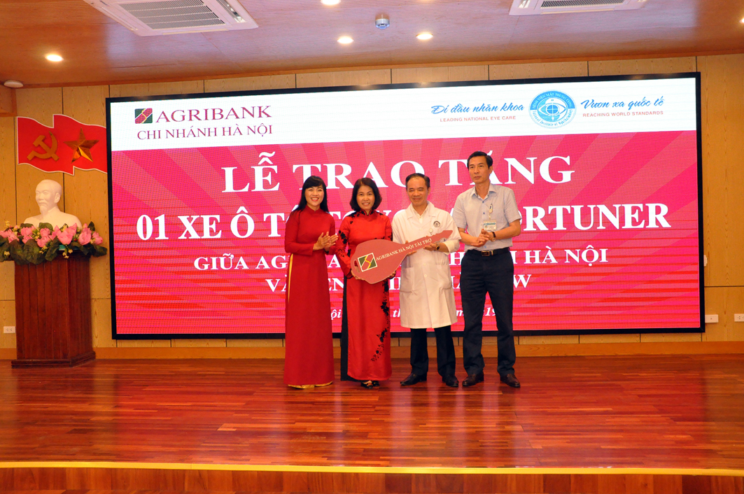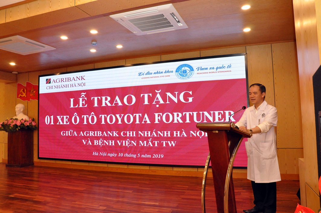 PGS.TS. Nguyễn Xuân Hiệp thay mặt CBVC bệnh viện Mắt TW cảm ơn món quà mà ngân hàng Agribank chi nhánh Hà Nội trao tặng. Bên cạnh giá trị về mặt vật chất, điều đáng quý hơn là tấm lòng, trách nhiệm chung tay đối với sự nghiệp chăm sóc sức khỏe nhân dân của lãnh đạo và cán bộ nhân viên của Agribank chi nhánh Hà Nội. PGS.TS. Nguyễn Xuân Hiệp cam kết bệnh viện sẽ sử dụng chiếc xe một cách hiệu quả, nâng cao chất lượng công tác chỉ đạo tuyến, khám chữa bệnh tại địa phương cũng như các hoạt động của Ngân hàng mắt.