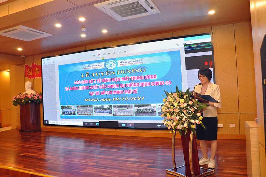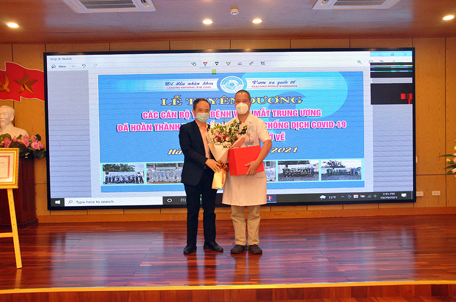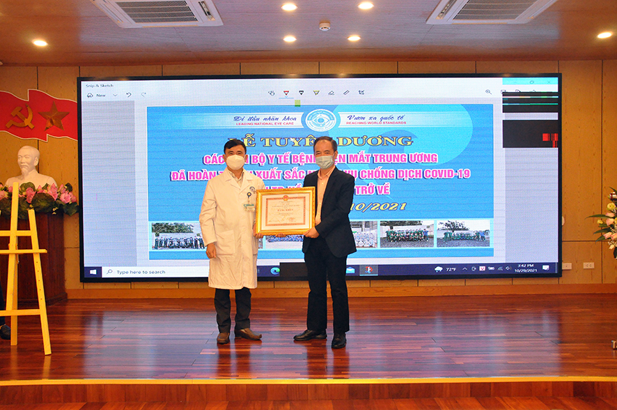 Tại buổi lễ, PGS.TS Nguyễn Xuân Hiệp - Bí thư Đảng ủy, Giám đốc Bệnh viện Mắt Trung ương không giấu được sự xúc động, tự hào và vui mừng khi thấy tất cả các thành viên của hai đoàn công tác đã hoàn thành xuất sắc nhiệm vụ do Bộ Y tế và bệnh viện giao, mạnh khỏe và an toàn trở về sau gần 2 tháng căng mình chạy đua với thời gian, cùng các đồng nghiệp các bệnh viện khác chung tay giành lại sự sống cho những bệnh nhân mắc COVID-19 tại bệnh viện dã chiến số 16 - một trong những nơi điều trị bệnh nhân trong tâm dịch nóng nhất của cả nước trong thời gian qua.