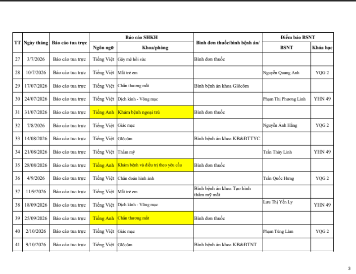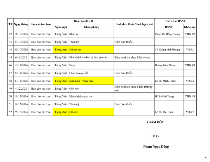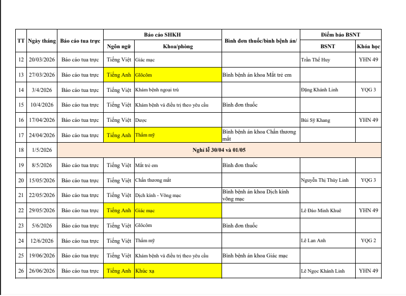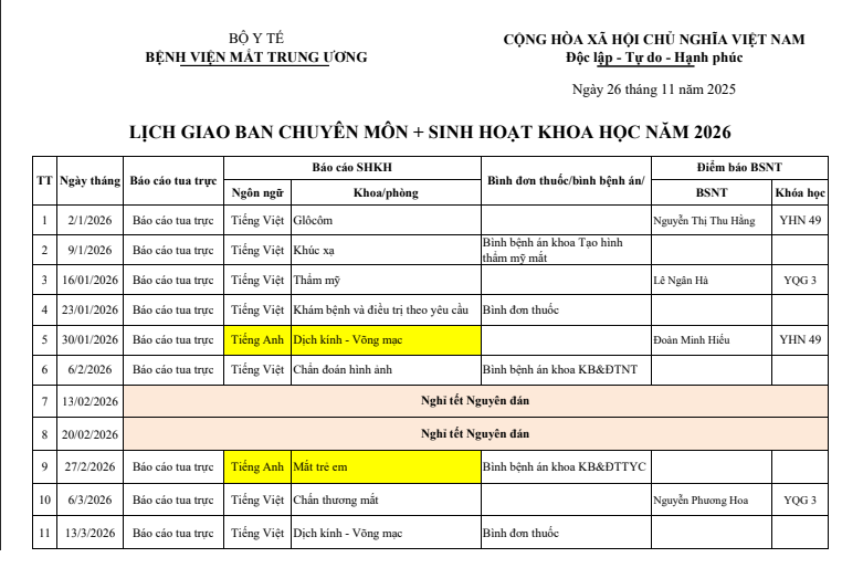 Lịch giao ban chuyên môn và sinh hoạt khoa học năm 2026