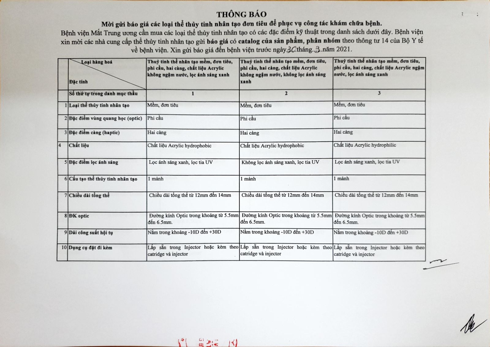 Bệnh viện Mắt TW cần mua các loại thủy tinh thể nhân tạo đơn tiêu để phục vụ công tác khám chữa bệnh, có các đặc điểm kỹ thuật trong danh sách dưới đây. Bệnh viện xin mời các nhà cung cấp gửi báo giá có catalog của sản phẩm, phân nhóm theo thông tư 14 của Bộ Y Tế về Bệnh viện. Xin gửi báo giá trước ngày 30/3/2021