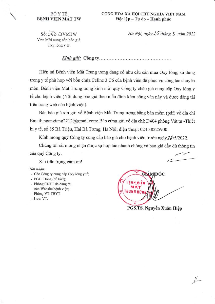 Thư mời báo giá để tham khảo làm cơ sở xây dựng các dữ liệu cho dự toán văn phòng phẩm, vật phẩm hành chính sử dụng trong 02 năm 2026-2027 tại Bệnh viện Mắt Trung ương