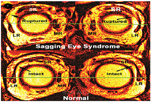 Hai ảnh phía trên phim MRI diện coronal cho thấy sự di lệch xuống dưới của cơ trực ngoài (LR) ở cả hai mắt do đứt dải liên kết giữa cơ trực trên (SR) và cơ trực ngoài (LR) hai bên. Hai ảnh dưới cùng hiển thị giải phẫu bình thường. Đường ngang chỉ vị trí trung tâm của cơ trực trong (MR)
