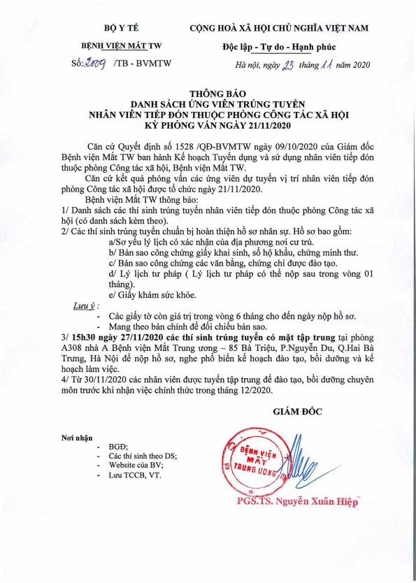 Thông báo - Kết quả trúng tuyển và hoàn thiện hồ sơ đối với thí sinh trúng tuyển kỳ xét tuyển viên chức năm 2020 của Bệnh viện Mắt Trung ương.