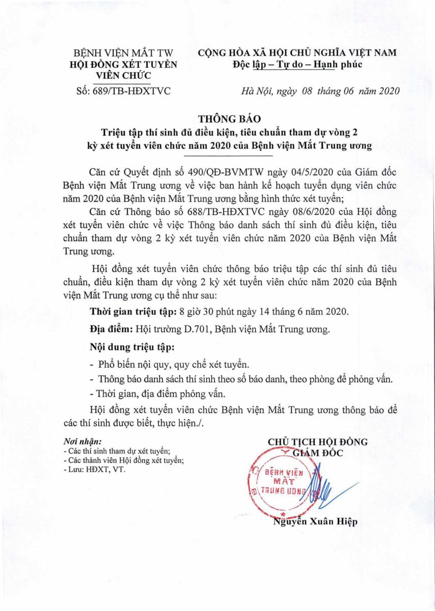 Thông báo - Triệu tập thí sinh đủ điều kiện, tiêu chuẩn tham dự vòng 2 kỳ xét tuyển viên chức 2020 của Bệnh viện Mắt Trung ương
