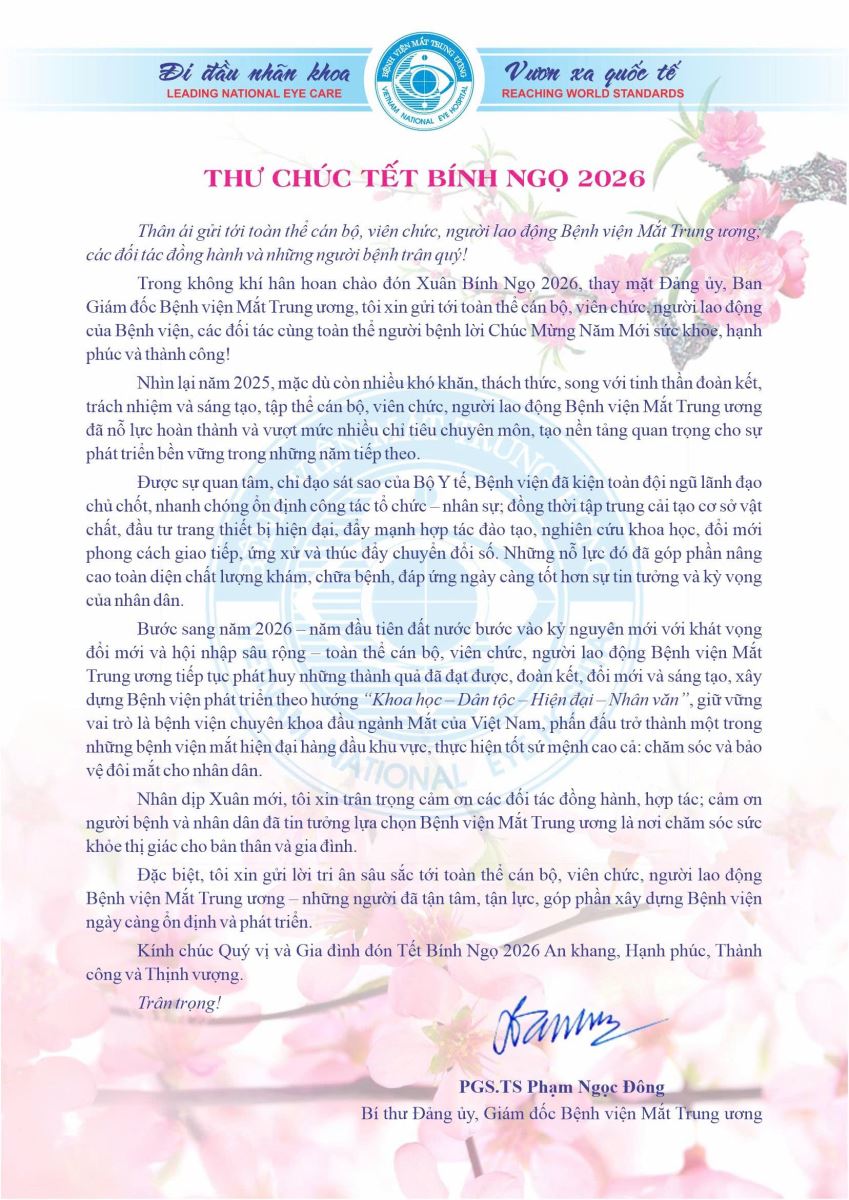 Nhân dịp Xuân mới, tôi xin trân trọng cảm ơn các đối tác đồng hành, hợp tác; cảm ơn người bệnh và nhân dân đã tin tưởng lựa chọn Bệnh viện Mắt Trung ương là nơi chăm sóc sức khỏe thị giác cho bản thân và gia đình.