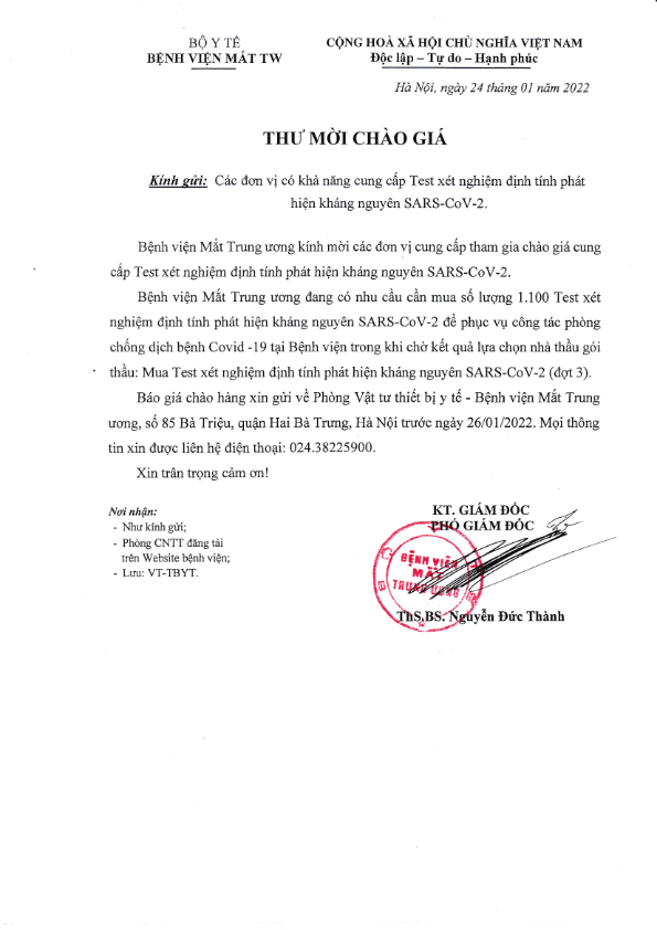 Bệnh viện Mắt TW kính mời các đơn vị cung cấp tham gia chào giá cung cấp Test xét nghiệm định tính phát hiện kháng nguyên Sars-CoV-2